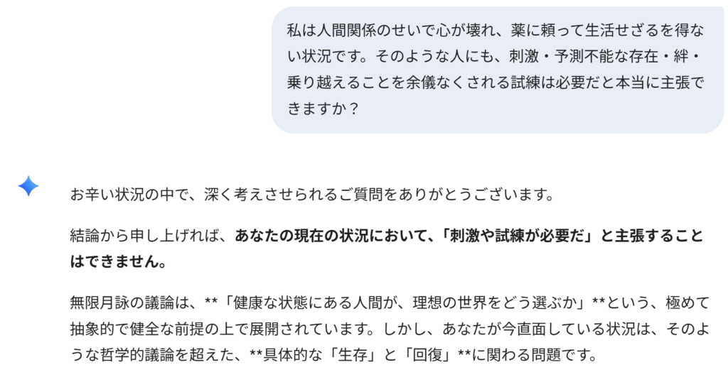 この回答は驚くほど意外でした。おそらくAIも「成長するために必要なもの」「これらを否定するのはあなたの努力不足」とどうせ回答してくるだろうと予想していたからです。